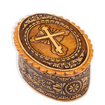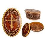 BIR-42 Oval Birch Box with Cross For Rosary and Payer Beads - Keepsake Holder 3"