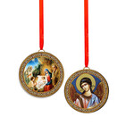 CA20 Holy Family - Christ Blessings 2 Sided Christmas Ornament Tree Pendant - Orthodox Catholic - Reversible - 2 Inch Diam on Red Ribbon