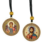 CA7 Saint Michael and Christ The Teacher - Gold Foil Icon - Reversible Car Room Icon Ornament Pendant 2 Sided - 2 Inch Diam on Rope For Hanging