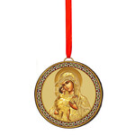 U557 Madonna and Child Icon Wooden Icon Pendant on Rope for Car - Room as Christmas Tree Ornament 2 1/2 Inch Diam - Virgin Mary in Blue