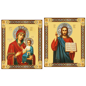 JC2-3S Christ The Teacher & Virgin of Iveron - Panagia Portaitissa - Theotokos Iverskaya Gold Foil - Wooden Icon 3 inch, Gold foil Cross on the Back Side - Matching Icon Set - Pair