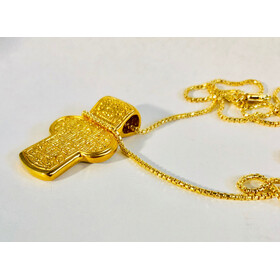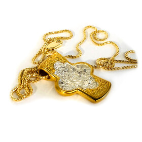 The front is a representation of the icon of the Decent Into Hell. In the Eastern Church the Feast of Pascha (Easter) consists of two feasts. First - Christ’s Decent into Hades (Hell) and His bodily Resurrection from the Dead. This Cross show Christ (the first burn from the dead) standing on the Cross holding on one hand the triumphant raised Cross and with the other he is holding Adam's hand pulling him from the grave. On the other side is a representation of Eve who with Adam represents the human race.