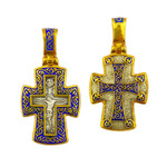 GP741ECW-CP-24 Sterling Silver 925 - 24 kt Gold Plated Three Barred Bar St Olga Cross With Blue Enamel 1 1/2" Including Bail - Saves Us on the Back Side in Russian