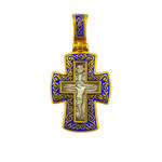 GP741ECW-CP-24 Sterling Silver 925 - 24 kt Gold Plated Three Barred Bar St Olga Cross With Blue Enamel 1 1/2" Including Bail - Saves Us on the Back Side in Russian