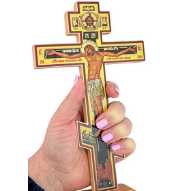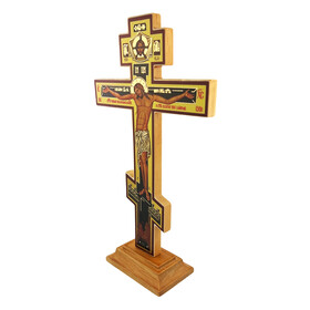 This high-quality wooden standing cross features a gold foil icon and measures 9¼ inches tall by 5⅜ inches wide. Thickness 6/8 inch