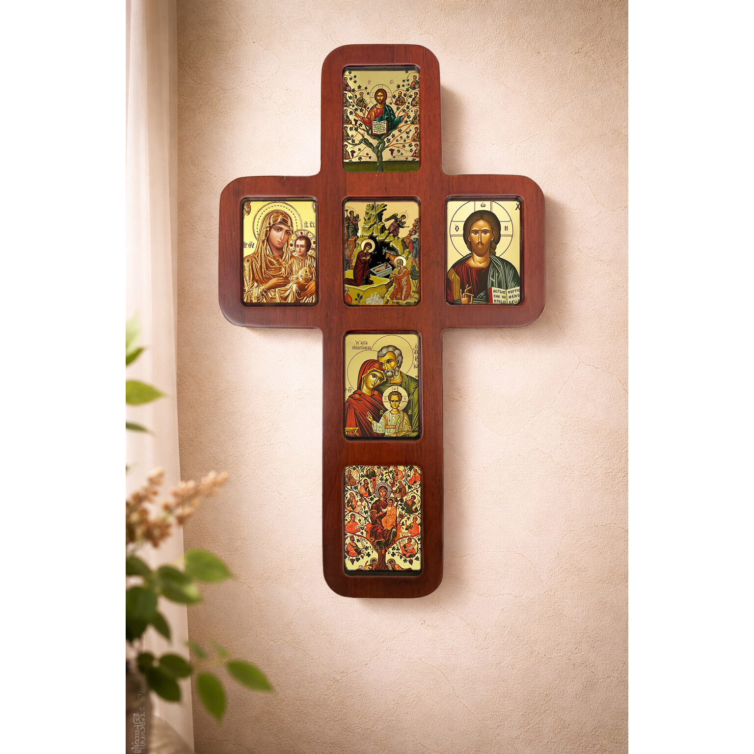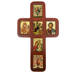 - Dimensions: Measuring 14 inches tall and 8 1/4 inches wide, with a thickness of 1/2 inch, this icon cross makes a striking statement. The icons inside the cross measure 2 3/4 inches tall by 2 inches wide.