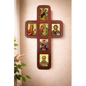 - Dimensions: Measuring 14 inches tall and 8 1/4 inches wide, with a thickness of 1/2 inch, this icon cross makes a striking statement. The icons inside the cross measure 2 3/4 inches tall by 2 inches wide.