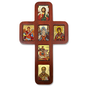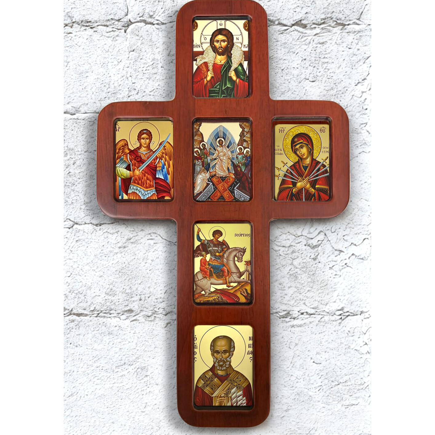 - Dimensions: Measuring 14 inches tall and 8 1/4 inches wide, with a thickness of 1/2 inch, this icon cross makes a striking statement. The icons inside the cross measure 2 3/4 inches tall by 2 inches wide.