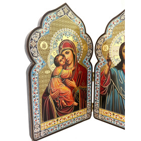 DM3 Church Dome Shape Diptych - Virgin of Vladimir and Christ The Teacher - Wooden 7 1/2 Inch, Cross on the Front and Back , For Travel or Home Display
