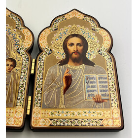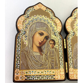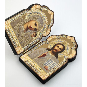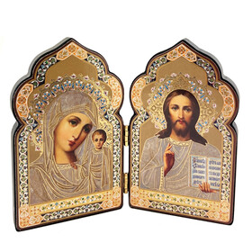 DM21-S Miniature Church Dome Shape Diptych - Virgin of Kazan and Christ The Teacher - Wooden 4 Inch, Cross on the Front and Back , For Travel or Home Display