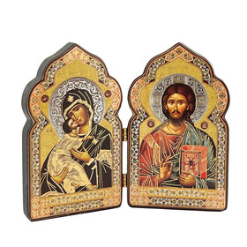 DM4-S Miniature Church Dome Shape Diptych - Byzantine Icons Virgin of Vladimir and Christ The Teacher - Wooden 4 Inch, Cross on the Front and Back , For Travel or Home Display