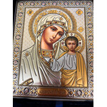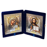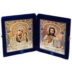 UD-3 Christ The Teacher and Virgin of Kazan Icon Diptych In Blue Velvet Case, 8 Inch, Silver Foil Icons