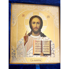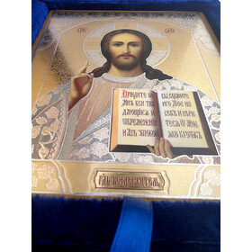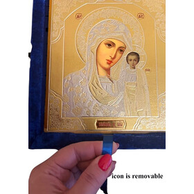 An elegant diptych of Christ Pantocrator with the Kazan Mother of God decopague icons in a folding leatherette case..