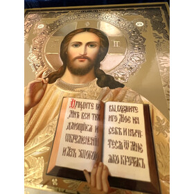 An elegant diptych of Christ Pantocrator with the Kazan Mother of God decopague icons in a folding leatherette case..