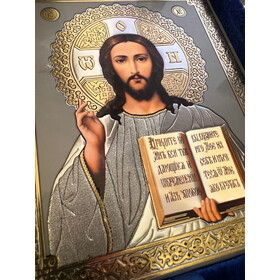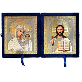An elegant diptych of Christ Pantocrator with the Kazan Mother of God decopague icons in a folding leatherette case..