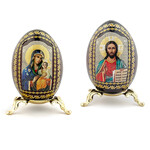 IED-4-3-4 Pair Virgin Mary Eternal Bloom and Christ Wood Icon Eggs on Gold Metal Stand - Set of 2