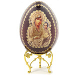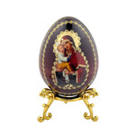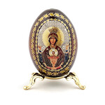 IED-10-39 Virgin Mary Wooden Russian Icon Egg With Gold Stand 6 1/2"