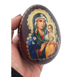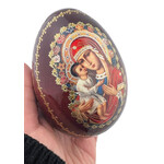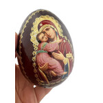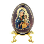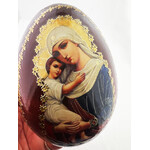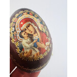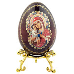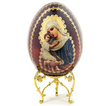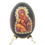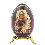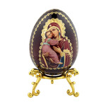 IED-10-28 Virgin Mary Virgin of Vladimir Wooden Russian Icon Egg With Gold Stand 6 1/2"