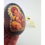 J-E-3 Madonna and Child - Wooden Decoupage Gold Foil Icon Egg on Gold Tone Metal Egg Stand Holder 5 1/2 Inch