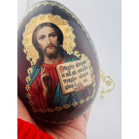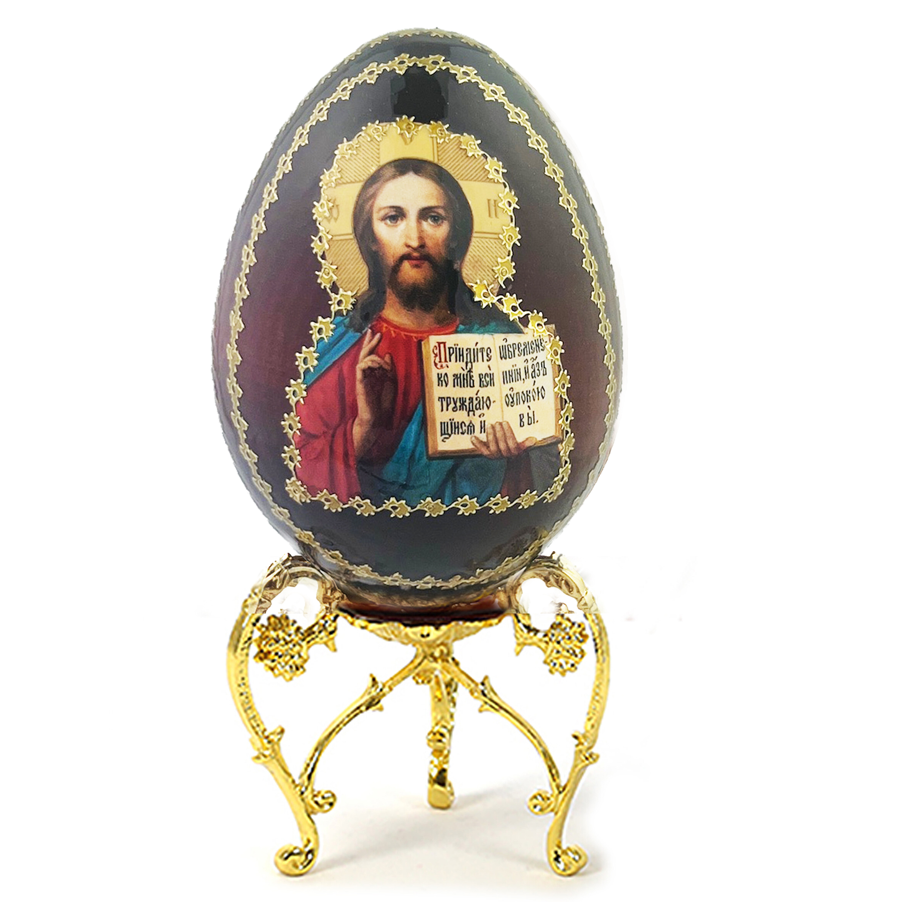 IED-10-32 Christ The Teacher Wooden Russian Icon Egg With Gold Metal Stand 6 1/2" - Gold Foil Icon