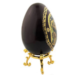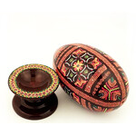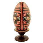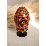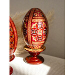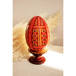 7012R-ES2 Red Hand Painted Wooden Ukrainian Pysanky Egg on a Gold Stand - The Designs on The Egg Will Vary