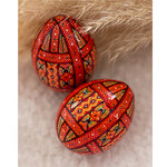 7012R-3-ES-3 Red Hand Painted 3 Wooden Ukrainian Pysanky Eggs on a Wooden Stand - The Designs on The Egg Will Vary