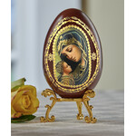 J-E-3 Madonna and Child - Wooden Decoupage Gold Foil Icon Egg on Gold Tone Metal Egg Stand Holder 5 1/2 Inch