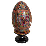 U327 Pysanka Egg - Goose Size - Wooden Hand Painted on Its Hand Painted Egg Holder Stand - Featuring Cross Design on The Egg 4 1/2 inches