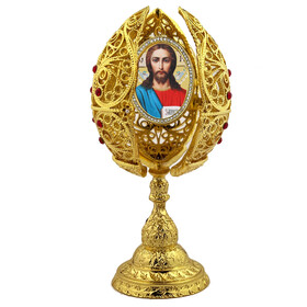 M-39-26S Faberge Style Filigree Icon Egg - Triptych With Hanging Framed Icon Inside -Christ The Teacher - Decorated With Faux Crystals - 6 Inch Tall