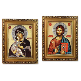 16-17 Matching Pair - Virgin of Vladimir & Christ The Teacher Icon - Gold Wooden Framed - Wall Hanging With Stand 7 3/4 Inch tall