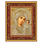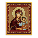 R5 Virgin of Kazan Gold Foil Icon in Burgundy Frame Decorated With Crosses - Wall hanging and Comes With Its Stand 5 1/2 inch Tall