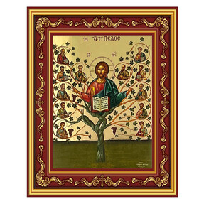 RX2806 Gilded Greek Byzantine Icon - CHRIST, THE VINE-TREE With Apostles - Authentic Greek Orthodox Byzantine Icon Gold Foil Framed - Wall Hanging and Standing - Burgundy Wooden Frame Decorated With Crosses 5 1/2 inch Tall