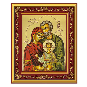 RX3229 Holy Family Greek Byzantine Gold Foil Icon in Burgundy Frame Decorated With Crosses - Wall hanging and Comes With Its Stand 5 1/2 inch Tall