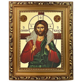 Home/Greek Icons/Framed Greek Icons/X7097 CHRIST, THE GOOD SHEPHERD - Gilded - 9 3/4"x7 1/2" Byzantine Greek Icon - Wooden Frame With Stand For Standing and Hook For Hanging on Wall