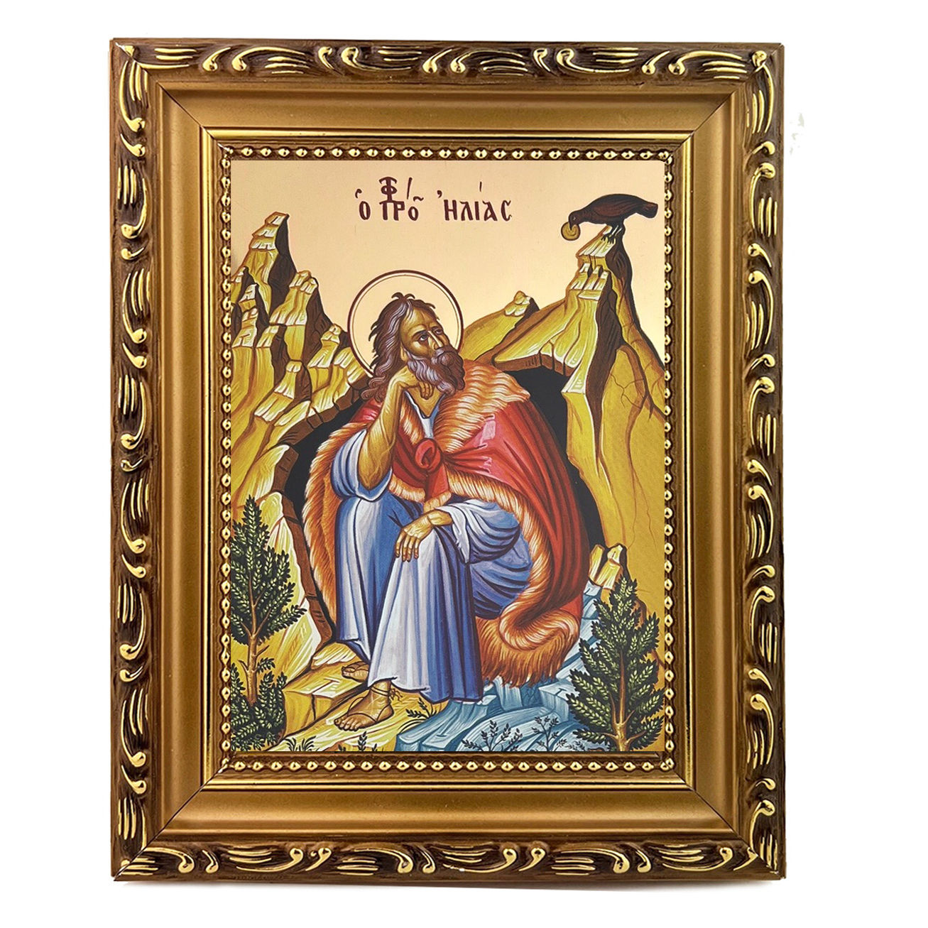This stunning icon features the Holy Prophet Elias (Elijah) depicted in the cave, beautifully framed and ready for display. Measuring 7¼ inches by 5¾ inches, this Greek Orthodox Byzantine icon comes with a stand for tabletop display and a hook for easy wall hanging.About the Holy Prophet Elias: