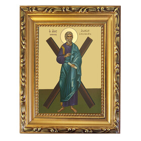 - Saint Andrew the Apostle, The First-Called - Gold Foil Orthodox Byzantine IconThis stunning full-body icon of Saint Andrew the Apostle, renowned as the first-called Apostle, is beautifully framed and features intricate gold foil detailing. While rooted in Orthodox tradition, Saint Andrew is also revered in the Catholic Church, making this icon a meaningful piece for Christians of various denominations. Displayed as a wall hanging, it serves as a powerful reminder of faith, apostleship, and the universal call to discipleship.