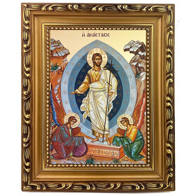 Home/Greek Icons/Framed Greek Icons/X7579 Resurrection of Christ, Angels, Christ Holding Three Bar Cross - Gilded 9 3/4"x7 1/2" - Byzantine Greek Icon - Wooden Frame With Stand For Standing and Hook For Hanging on Wall