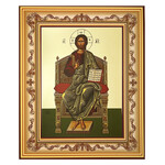 G4584X Christ Blessing, Enthroned - Gold Gilded Byzantine Greek Icon - in Wooden Frame Decorated With Crosses Comes With Stand For Standing and Hook For Hanging on Wall 7 1/4"x5 3/4"
