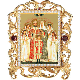 M-38-85s Royal Family Russian Gold Foil Icon Framed In Jeweled Frame, Decorated With Faux Crystals, 4 Inch
