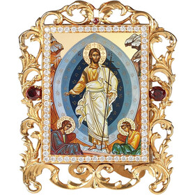 M38X3525 Resurrection Icon Greek Gilded - Framed In Jeweled Frame, Decorated With Faux Crystals, Icon is Covered With Glass 4 Inch