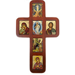 WC3-2 Greek Icon Cross - 14 Inch Oak Wood - Resurrection of Christ, Transfiguration, Nativity, Perpetual Help, Christ, Seven Swords - Icons are Gold Foiled