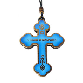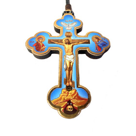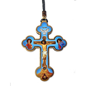 U487 Byzantine Icon Cross - Small Wooden Icon Cross Crucifix on Rope Save Us on the Back 3 1/2 Inch, Dove Holy Spirit on Top of The Cross