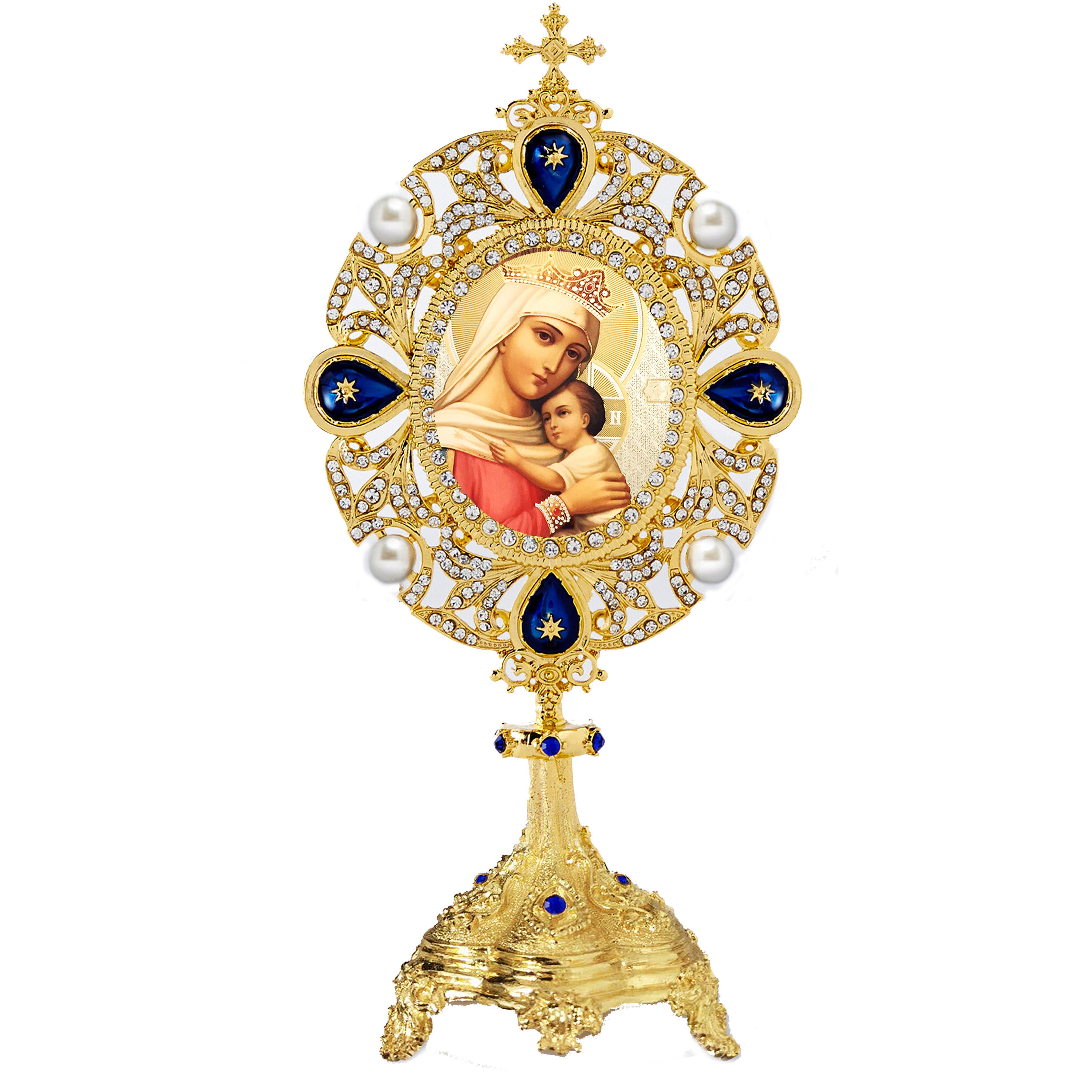 • Catholic Orthodox Christian Icon - Jeweled Enameled and Decorated With Faux Pearls - Cross on Top - Material Gold Color Metal