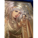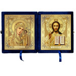 UD-7 Christ The Teacher and Virgin of Kazan Icon Diptych In Blue Velvet Case, 8 Inch, Silver Foil Icons