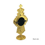 M403301 Virgin Mary and Christ - Virgin The Healer Greek Byzantine Icon - Greek Byzantine Icon Byzantine Orthodox Catholic Gilded Greek Icon in Jeweled Metal Cross With Crown Decorated With Faux Crystals and Pearls - Standi