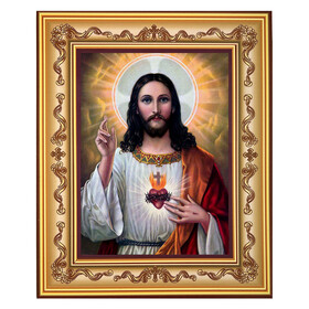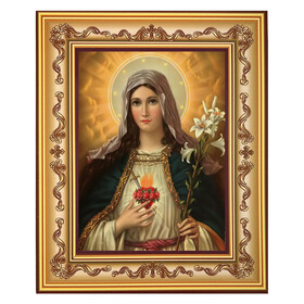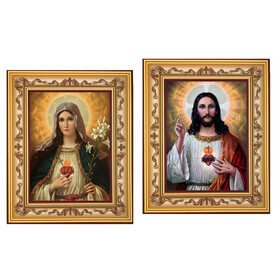 G22-71 Immaculate Heart of Mary & Sacred Heart of Jesus Matching Pair - Wooden Gold Frame With Stand For Standing and Hook For Hanging on Wall 7 3/4"x6 1/4"