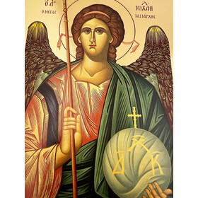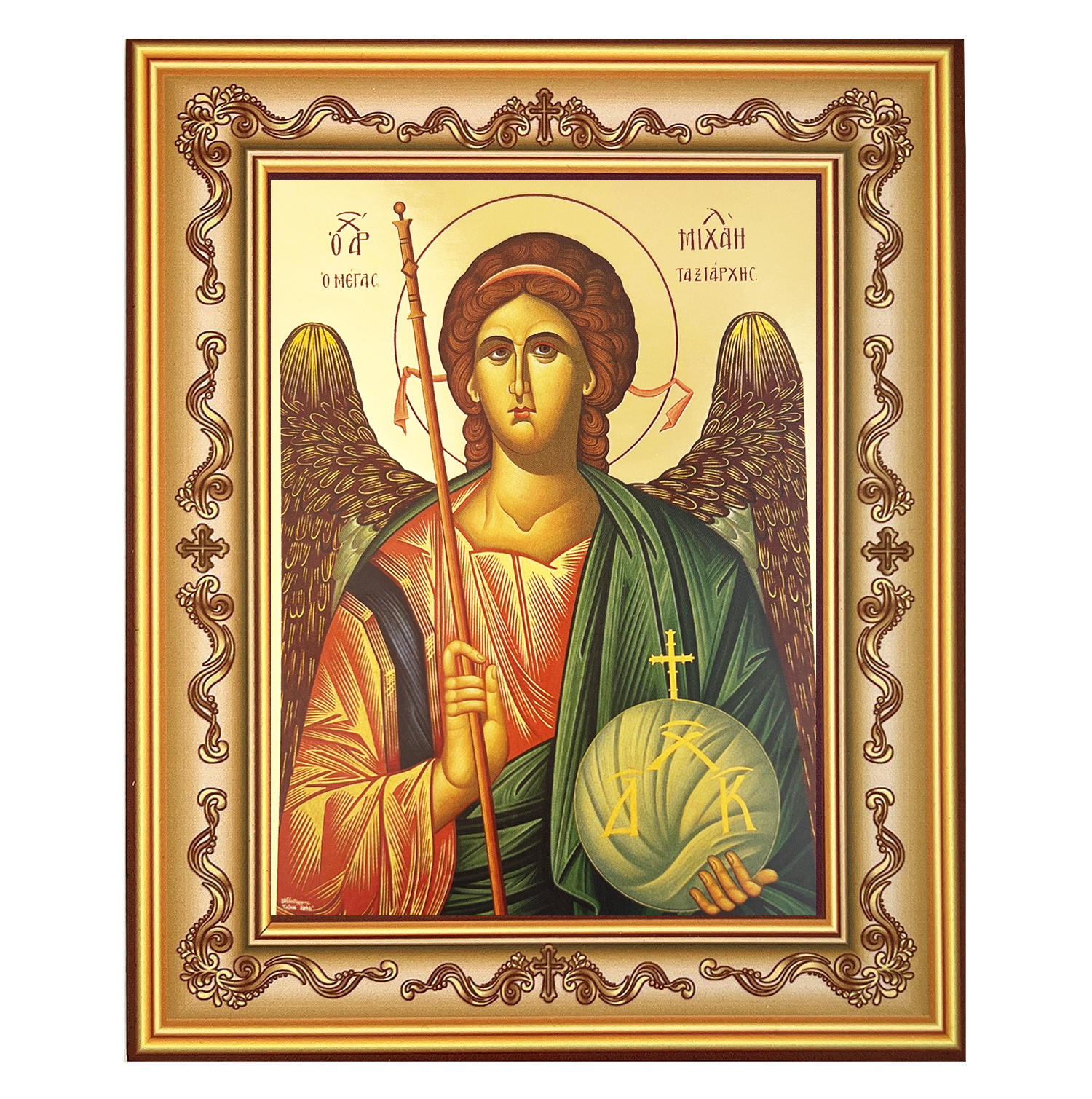 GX5043 Archangel Μιchael - Gold Gilded Byzantine Greek Icon - in Wooden Frame Decorated With Crosses Comes With Stand For Standing and Hook For Hanging on Wall 7 1/4"x5 3/4"