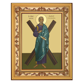 - Saint Andrew the Apostle, The First-Called - Gold Foil Orthodox Byzantine IconThis stunning full-body icon of Saint Andrew the Apostle, renowned as the first-called Apostle, is beautifully framed and features intricate gold foil detailing. While rooted in Orthodox tradition, Saint Andrew is also revered in the Catholic Church, making this icon a meaningful piece for Christians of various denominations. Displayed as a wall hanging, it serves as a powerful reminder of faith, apostleship, and the universal call to discipleship.