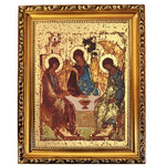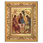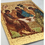 MTMS Holy Trinity Icon Silkscreen on Cotton Canvas - Gold Gilded Byzantine Greek Icon - in Wooden Frame Decorated With Crosses Comes With Stand For Standing and Hook For Hanging on Wall 7 1/4"x5 3/4"