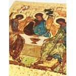 GMTMS Holy Trinity Icon Silkscreen on Cotton Canvas - Gold Gilded Byzantine Greek Icon - in Wooden Frame Decorated With Crosses Comes With Stand For Standing and Hook For Hanging on Wall 7 1/4"x5 3/4"